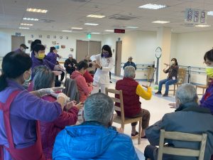 活動一開始,胡涵喻個管師邀住民坐在椅子上大家圍成一圈,從簡單的手部運動開始做起,大拇指碰大拇指、手掌拍手掌,中間加入肢體柔軟度運動,如雙手繞到後背上下互扣。暖身過程中,長輩們動作若有錯誤老師會即時矯正,為了增加阿姨伯伯們的樂趣及培養感情,還使用五彩繽紛的彈力繩來促進上下肢的運動量,希望透過這些活動促進認知功能及預防失智。