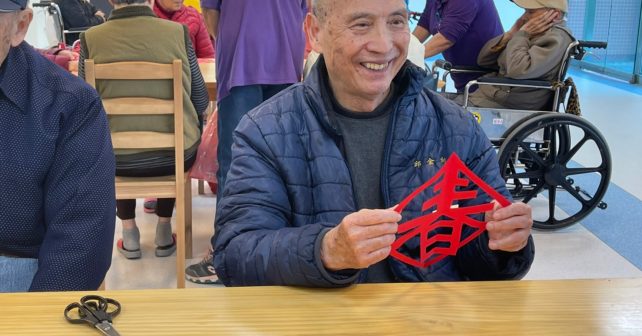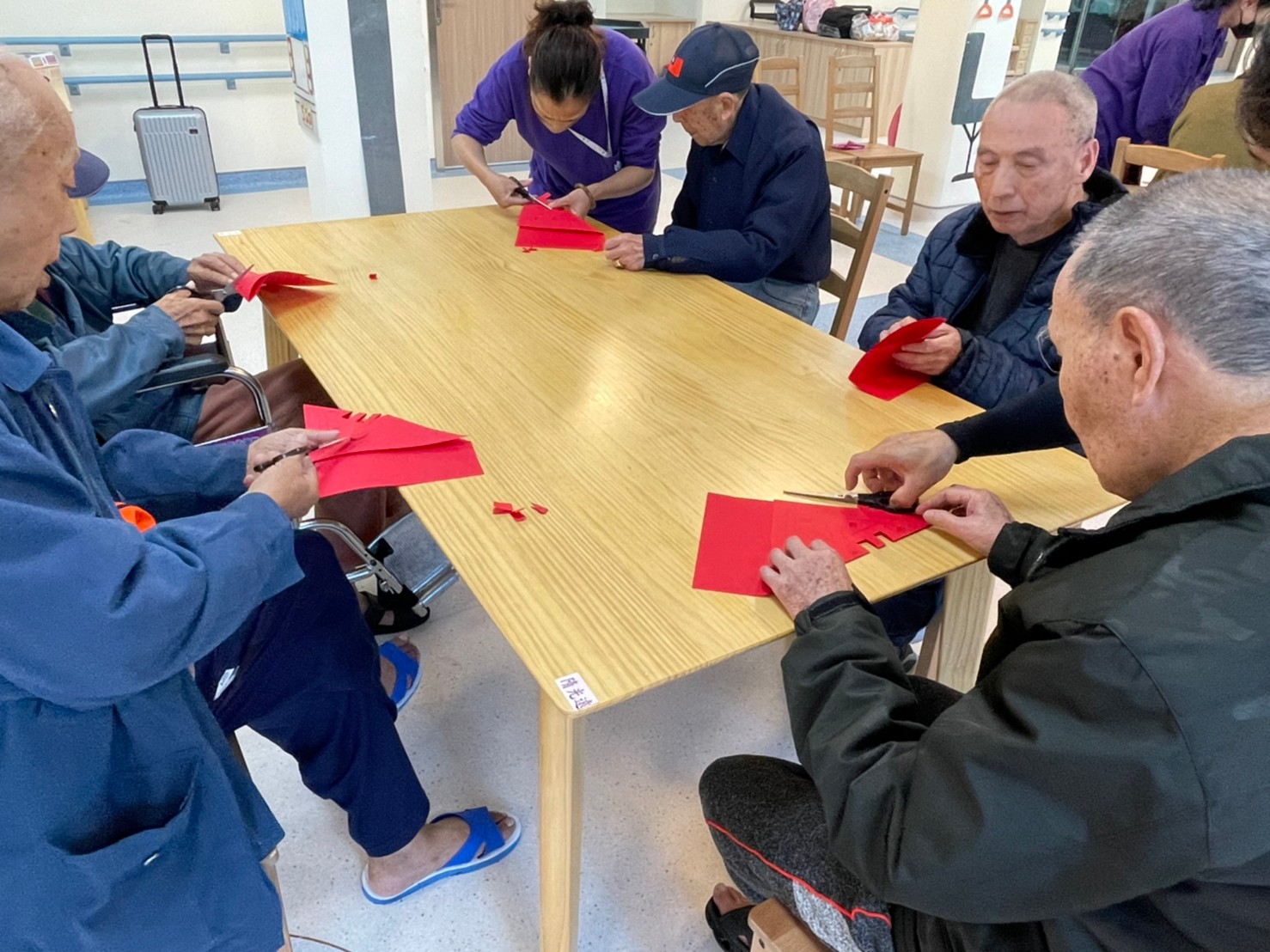 最後為了迎接新春到,胡涵喻還引導長輩剪出一幅幅可愛的春字,看似單純的剪紙活動,可是要付出相當的專注力和細心才能完成喔!過程中,每位長輩對於剪紙的熟悉度與完成的速度都不盡相同,老師很有耐心地每桌教導,長輩間也會互相關心提醒,一幅幅紅色喜氣洋洋的春字剪紙便完成了!