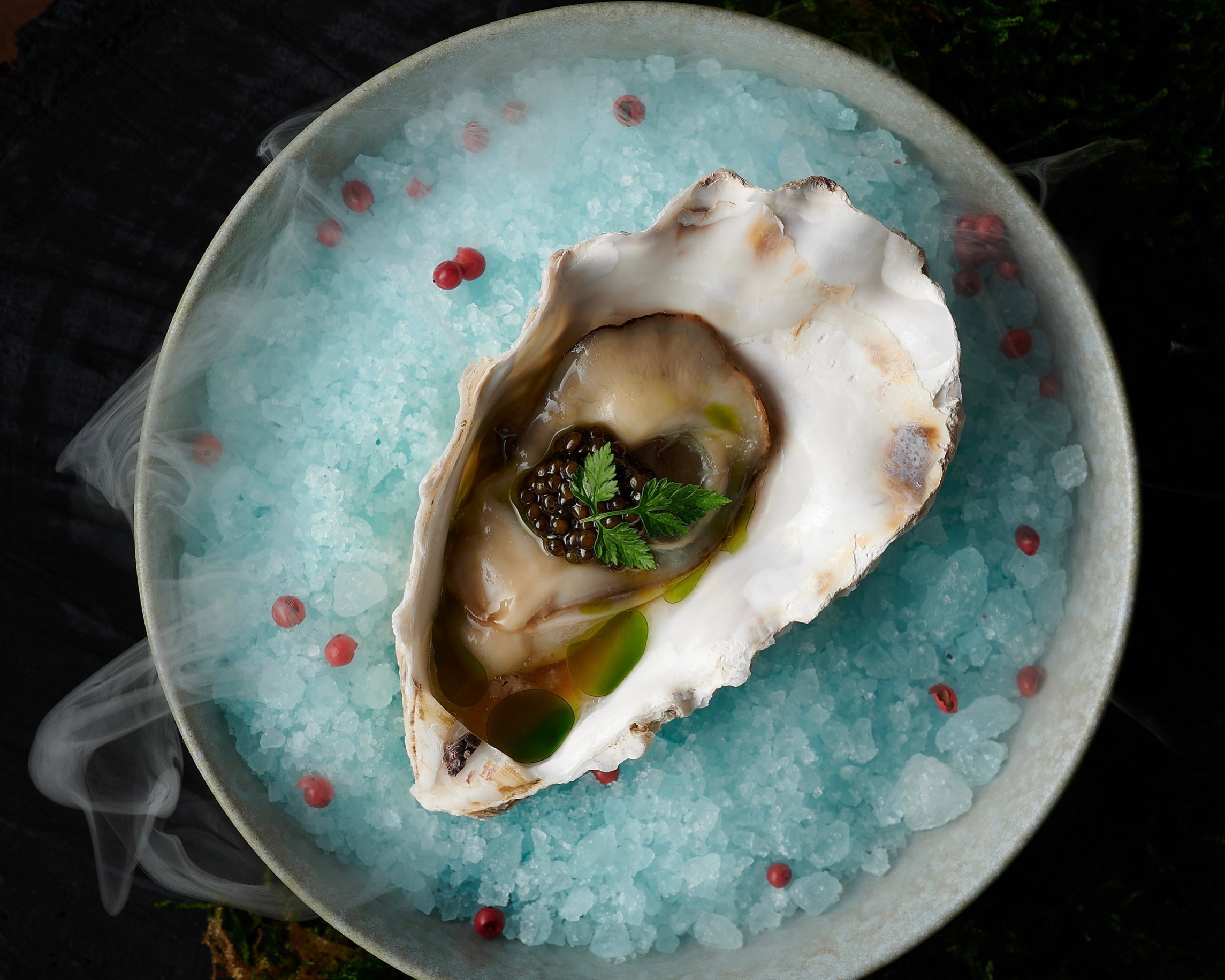 映景觀餐廳米其林主廚Bruce以中秋烤肉為創意發想依據,將生蠔、鮮魚、雞翅、牛小排、筊白筍等烤肉必備食材,運用法餐的拆解、堆疊、重組等手法,激盪出創意特色法式餐點,像是爽脆口感中帶著滿滿鮮味的【海膽海苔脆餅】、入口即化甜鹹交織的【鴨肝野莓千層】,還有以宜蘭頭城大溪漁港的甜蝦製成的【甜蝦塔塔】,光是開胃小點就足以讓人驚艷;亦或是點綴時蘿橄欖油與薑汁味霖特製醬汁,堆疊出清新海味口感的【】;以及將雲林薩索雞的雞翅去骨後刷上主廚秘制醬料後微煎至香氣散出,並將二節翅翅中最細的橈骨搭配以豆鼓入味的雞肉丸烹炸定型的【薩索棒棒腿】。還有烤肉蔬菜組合中最常出現的筊白筍,主廚以【法式筊白筍濃湯】形態展現,將義大利帕馬火腿與薩索雞腿丁一同入湯熬煮,再以義大利黑松露油提味,入口滿滿的松露香氣,一連串的驚喜在口內逐一呈現。邊用餐還能邊享受優雅的小提琴演奏,為映景觀餐廳法式月光節增添浪漫愉悅的氛圍。