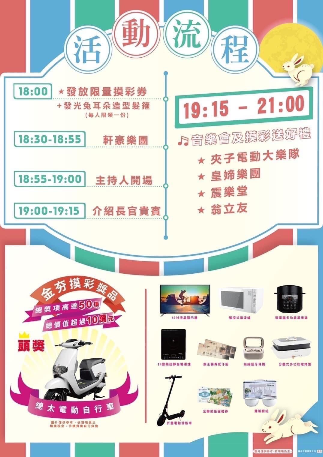 區長洪峰明表示,豐原區擁有豐富的觀光資源及豐碩的特色物產,每年區公所都會精心規劃舉辦各種不同類型的音樂藝術文化活動,以吸引各地遊客前來豐原觀光旅遊。本次特別邀請九天民俗技藝團副團長瑪利亞擔綱活動主持人,並邀請到重量級金曲台語歌王翁立友、以台客搖滾風格著稱的夾子電動大樂隊、本土宮廟搖滾代表震樂堂、跨界國樂女子樂團皇媂樂團,以及在地的軒豪樂團等帶來精彩演出。此外,在音樂會過程中將穿插摸彩活動,有電動自行車、43吋液晶顯示器、折疊電動滑板車、無線藍牙耳機…等總獎項高達50項,總價值超過10萬元的豐富摸彩獎品,以及政令宣導好禮大放送等攤位,歡迎大家逗陣來聽歌,再把豐富的獎品帶回家!