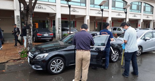 警方獲報到場勘查,一輛黑色賓士轎車遭不明人士持槍開約9槍,從彈孔研判是霰彈槍,現場和車內尋獲塑膠彈殼。