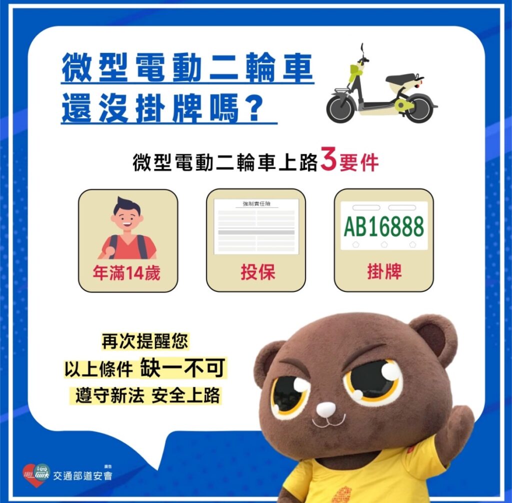 立法院於111年4月19日修訂道路交通管理處罰條例第69條之1微型電動二輪車,應經檢測及型式審驗合格,並「登記、領用、懸掛牌照」後,始得行駛道路,當時給予於修正施行前已經檢測及型式審驗合格,並黏貼審驗合格標章之微型電動二輪車2年寬限期(至113年11月29日)完成登記、領用、懸掛牌照。