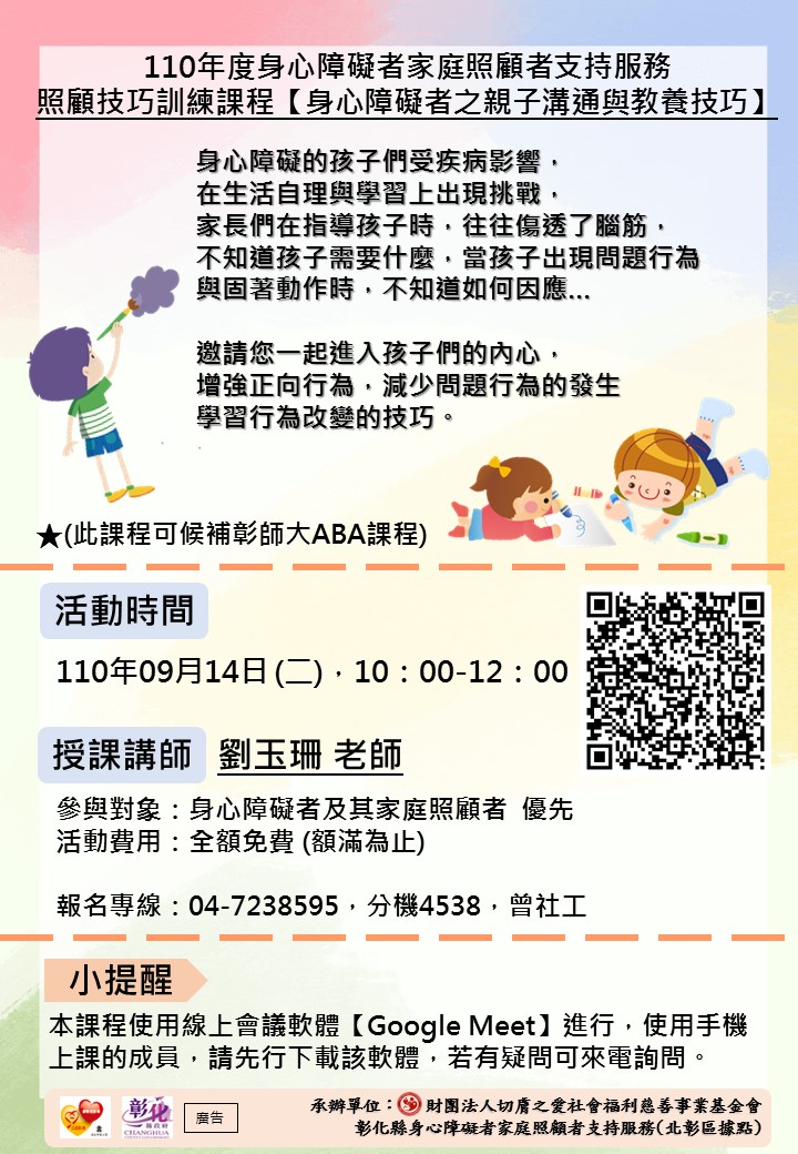地方新聞彰化縣 彰化縣【身心障礙者之親子溝通與教養技巧】家庭照顧者支持服務 陳 羿翔4 年 ago4 年 ago01 mins 【環衛新聞記者陳怡婷報導】 ●【身心障礙者之親子溝通與教養技巧】彰化縣身心障礙者家庭照顧者支持服務計畫「北彰區… Read More