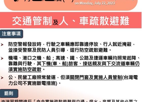 【環衛新聞特派記者鄭榕嫻報導】 為提升全民防空避難應變能力,113年萬安47號演習將於7月22日13:30至1…