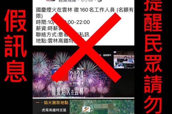 雲林縣 假訊息注意! 「國慶焰火在雲林」無徵求工作人員 榕嫻1 年 ago01 mins 【環衛新聞記者鄭忠嘉報導】 「這是假訊息!」2024國慶焰火將於10月10日晚間在雲林登場,有地方臉書社團(斗… Read More