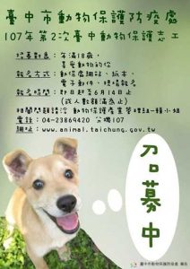 台中市動物保護防疫處為落實犬貓源頭管理,即日起至6月14日召募動保志工,協助動保處進行犬貓絕育、寵物登記電話訪查、收容犬隻梳洗美容等工作,只要滿18歲的民眾均可報名參加。