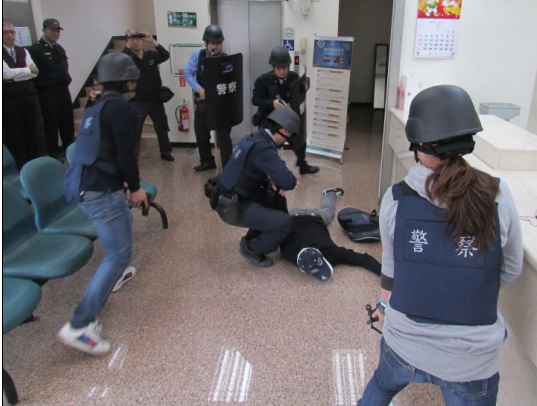 農曆春節將至,金融機構現金交易熱絡,易為歹徒覬覦而發生強盜、搶奪等犯罪,為強化員警防搶及攔截圍捕能力,銀行內歹徒遭優勢警力當場逮捕,在外接應二人見狀逃逸由台灣大道往梧棲區方向逃逸,員警通報勤務指揮中心實施攔截圍捕,線上警力獲報隨即開啟警報器前往各攔截圍捕點,最後於梧棲區台灣大道、中華路口攔獲目標車輛,多名員警荷槍實彈執行逮捕,過程逼真,震撼的場景讓許多路過民眾信以為真,紛紛走避躲離演練現場。