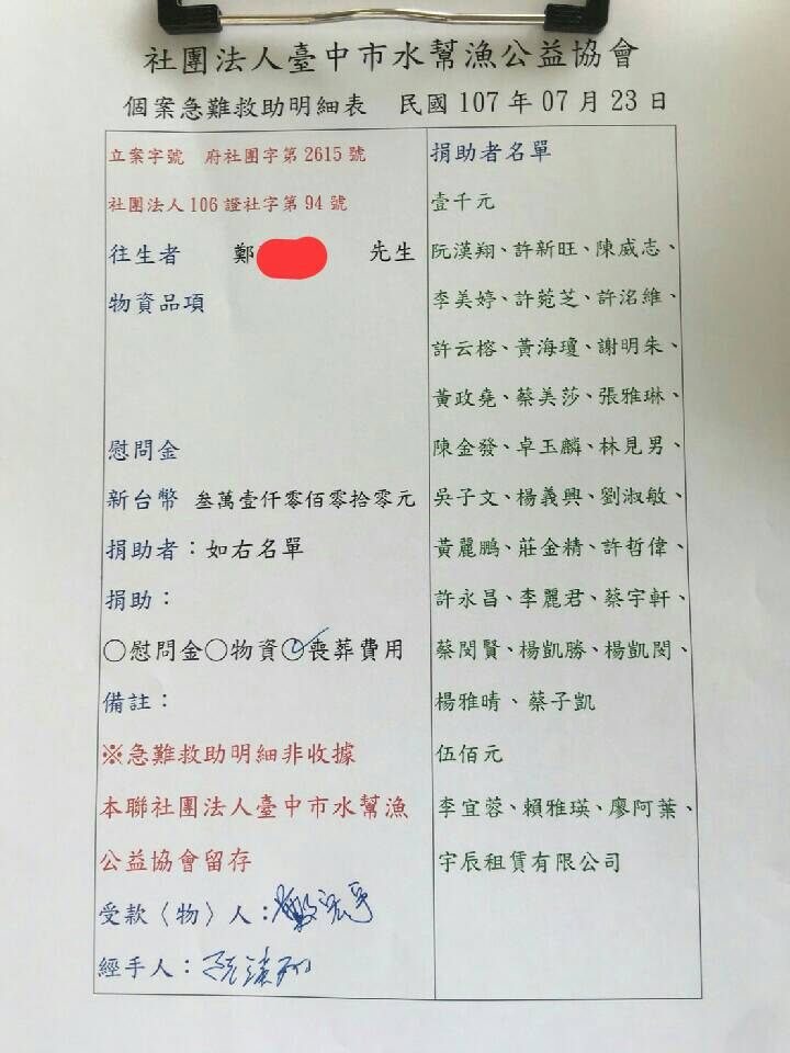 圖一:里長許國顯陪同鄭姓家屬受理水幫漁捐款。