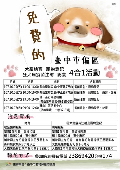 響應10月4日「世界動物日」,台中市動物保護防疫處自10月1日起進駐和平山區,並於10月5日~7日舉辦免費犬貓狂犬病疫苗注射、寵物登記、絕育手術及認養4合1活動,歡迎年滿20歲的台中市民攜帶寵物參加。