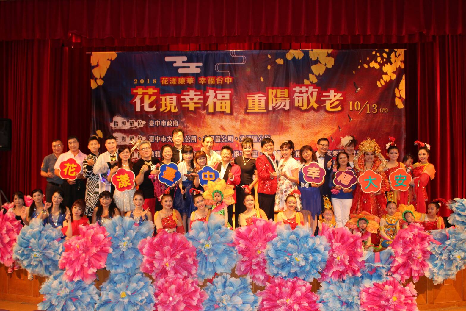 臺中市大安區公所繼去年辦理「2017重陽敬老‧藝起關懷」公益表演活動,深獲長輩肯定,表示節目好看,很熱閙。今年特別再次規劃辦理,並且搭配2018臺中花博,以花呈現編排數首花主題舞曲,共同行銷花博主題。大安區周琇茹區長、外埔區陳柏宏區長及大甲區公所民政課長出席,共同頒贈感謝狀,此次共有池雅歌唱育樂協會、鳳吟舞蹈藝術學苑、艾莉薩克斯風團、瓦兒舞蹈藝術工作室、培培動態藝術中心、十玄樂團、凡人樂團、佳緣舞團、富立衛星電視葉子、家宏及快樂咖舞團共11個表演團隊,4位主持人-周貴森、張小豐、歐陽莉英、小龍女,幕後還有黃麗霖彩妝顧問、黃敏良造型顧問、林泓丞錄影師、臺中市攝影學會、烏日攝影學會及邦博音響,全部參與人員約130人,全程公益演出及贊助。