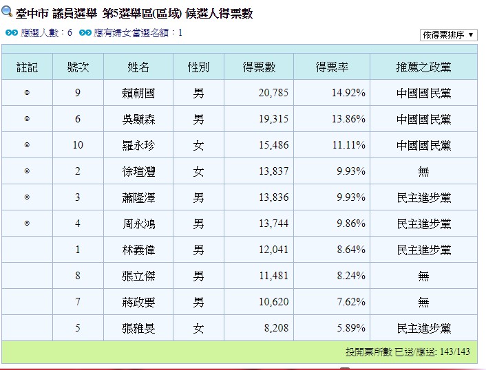台中市第五選區(潭子、大雅、神岡)議員選情競爭激烈,六席由國民黨賴朝國、吳顯森、羅永珍;無黨籍徐瑄灃;民進黨蕭隆澤、周永鴻拿下。此次九合一大選藍天在現,導致各區議員席次瓜分嚴重。