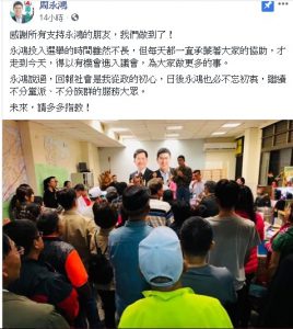 永鴻投入選舉的時間雖然不長,但每天都一直承蒙著大家的協助,才走到今天,得以有機會進入議會,為大家做更多的事。