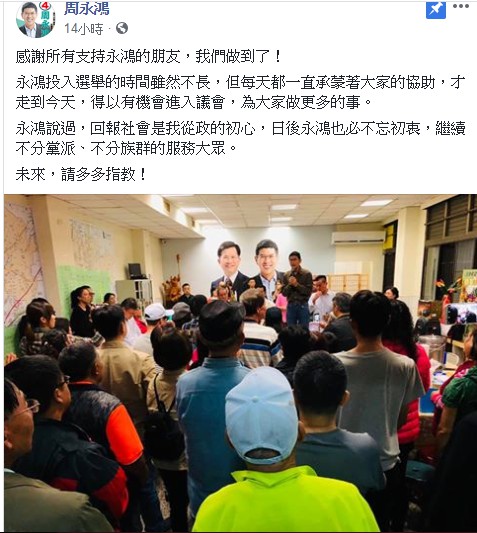 永鴻說過,回報社會是我從政的初心,日後永鴻也必不忘初衷,繼續不分黨派、不分族群的服務大眾。