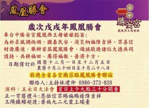 台中勝安宮主持林建仲表示:近年來天災人禍不斷,殺人分屍、騙財騙色、地震、水災、虐童等…道德淪喪的社會事件繁多,鳳凰西王母娘娘慈悲降示,為祈求風調雨順,國泰民安,要求辦理全國性大法會,並由台中勝安宮舉辦全國性首屆鳳凰勝會大法會,期望借由法會祈求風調雨順,國泰民安,消災納福,招財賜福,且安定人心。