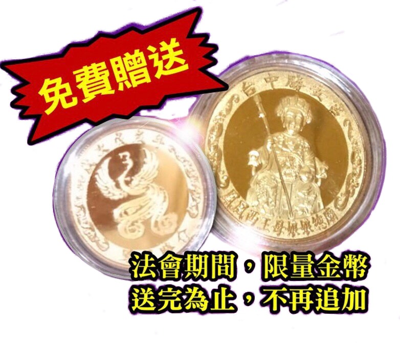 台中市沙鹿區勝安宮王母娘娘慈悲,為解蒼生之苦,特令台中勝安宮主持「林建仲」舉辦祈福大法會,法會當日該宮還發送「真」的金幣,給來排隊結緣的信眾拿回去保平安,為求慎重該宮還特請第六十五代張天師為金幣開光祈福。