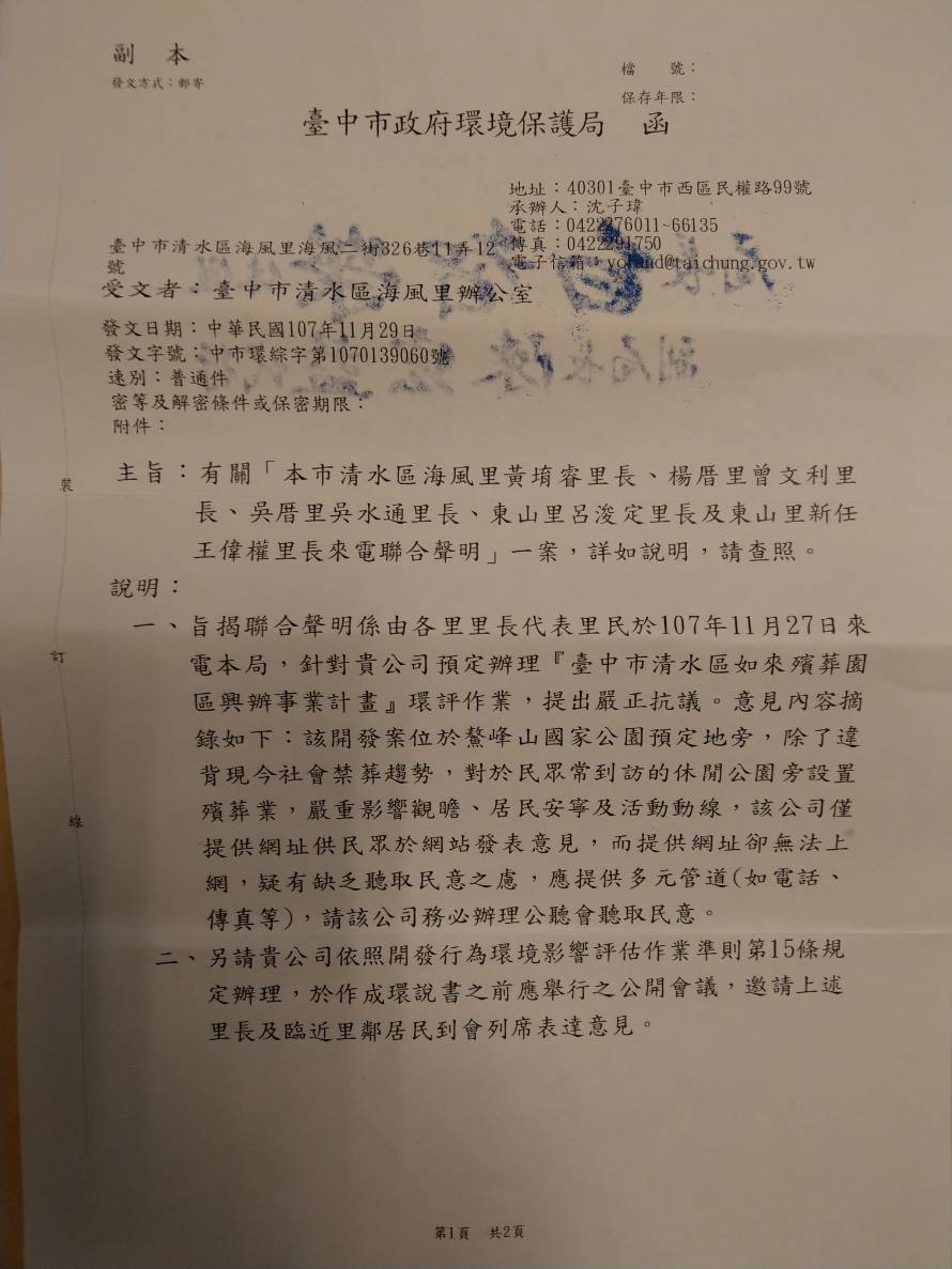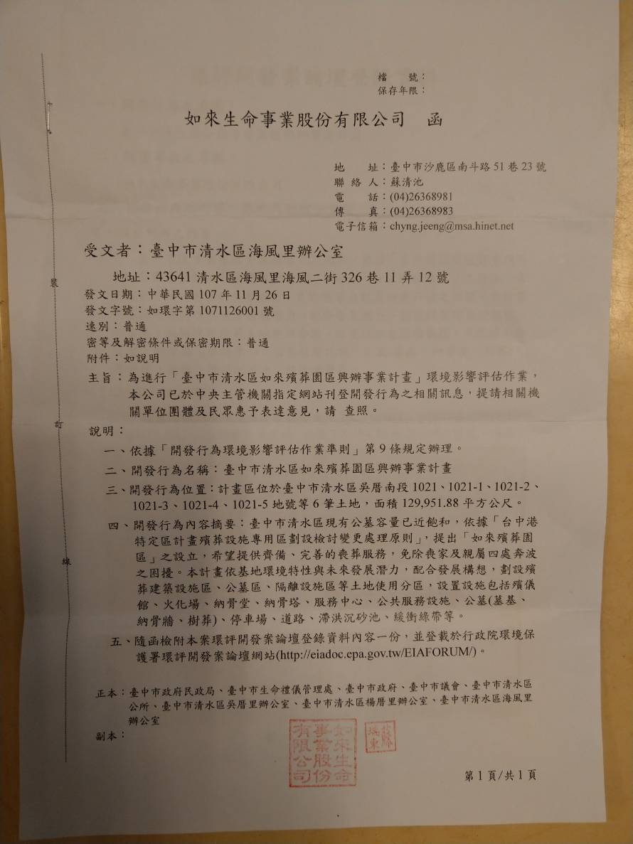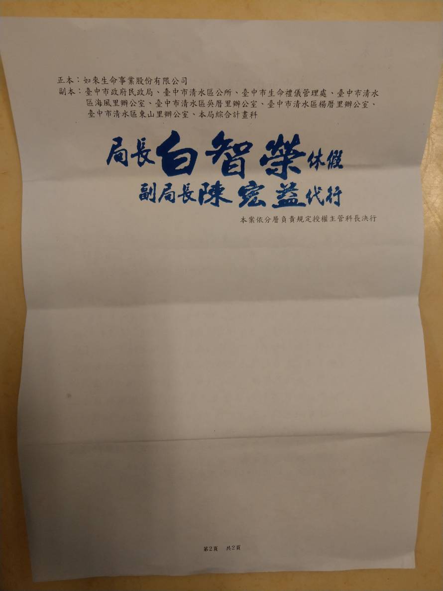 圖二:如來生命事業股份有限公司函文予清水區海風里服務處。