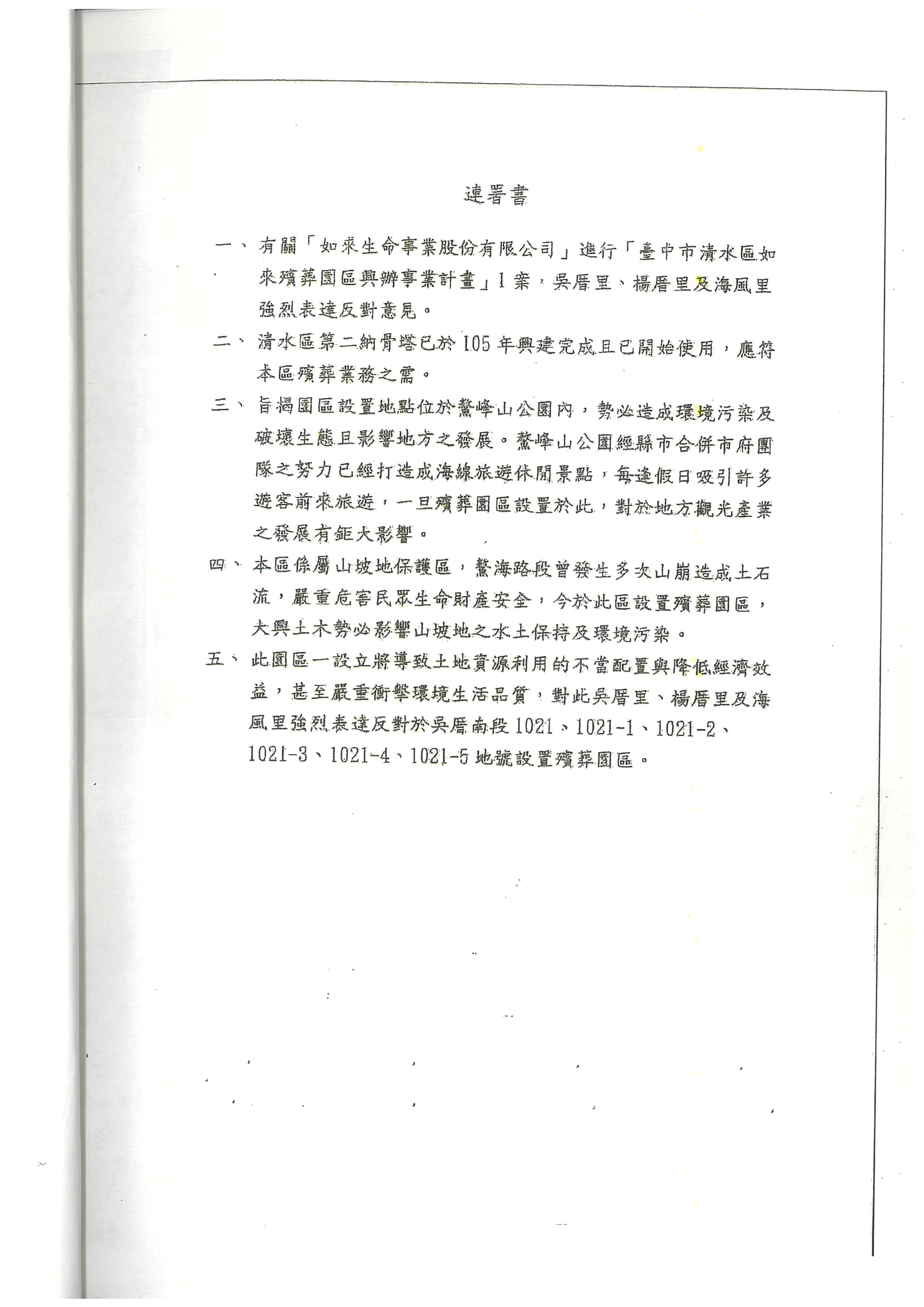 這塊位於清水區吳厝南段的「公墓用地」,如來生命事業公司於104年向市府提出「殯葬園區興辦事業計畫」,卻變更為「殯葬專區」,以設置火化場、納骨塔、殯儀館等設施。