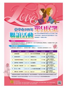 民政局說明,108年將持續辦理8場次單身民眾聯誼活動,各場次精心規劃亮點活動以創造更多認識心儀對象的機會,譬如透過月老加持的「樂成月老神助攻」,結合特色景點的「緣定海景摩天輪」,以及結合在地傳統人文的「舞動平埔情」、「客家文化結緣趣」等內容,讓參加的單身民眾能敞開胸懷、增進情誼,為彼此留下美好回憶。