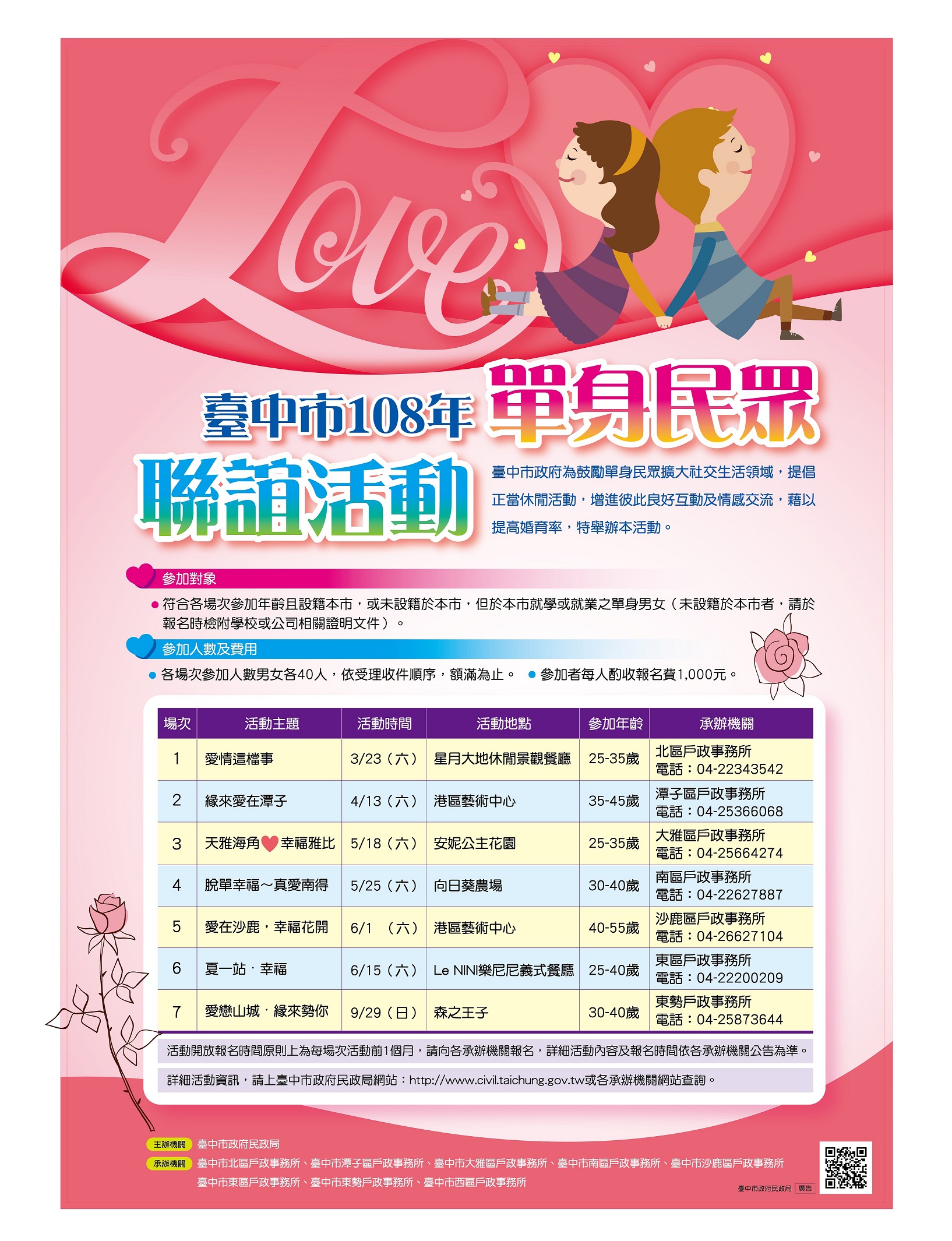 民政局強調,每場次單身聯誼活動主題均不相同,參加年齡條件也有差異,每場次一個月前開放民眾向承辦機關報名,男女分別限制40人,每人酌收報名費1000元,歡迎符合各場次參加年齡且設籍台中市,或於台中就學就業之單身民眾,把握機會踴躍報名,詳細活動資訊請上台中市政府民政局網站:( http://www.civil.taichung.gov.tw )查詢。