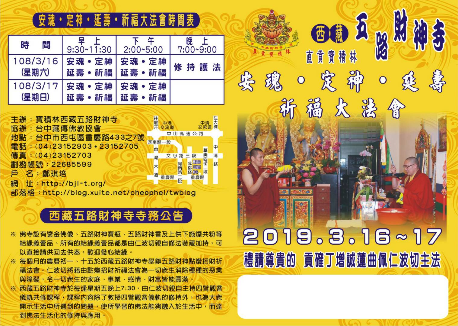 位於台中市西屯區有位來自西藏的仁波切,為”愛”離鄉背井,只因想改變社會病態、助弱勢、讓人藉由宗教精神上能有所慰藉及托付!也於「3/16至3/17兩日」在寶積林西藏五路財神寺,舉辦安魂˙定神˙延壽祈福大法會,望眾生一切平安順心。