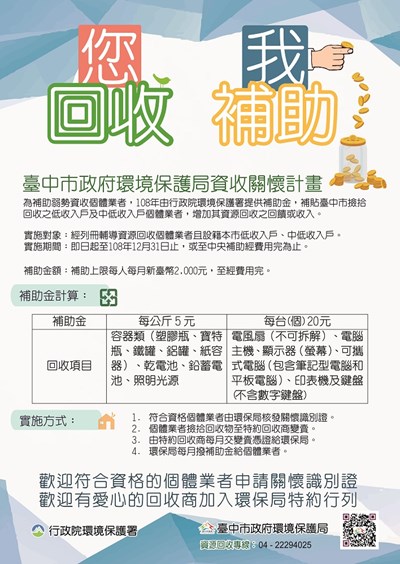為關懷弱勢資收個體戶,台中市政府環保局推動「資收關懷計畫」,只要是設籍台中市的低收入戶及中低收入戶資收個體戶,除平日變賣所得之外,再額外提供補助金,鐵鋁罐、紙容器、乾電池等每公斤補助回收金5元,電風扇、筆記型電腦、鍵盤等每台補助回收金20元,每人每月最高可補助2000元,兼顧資源回收與弱勢關懷。