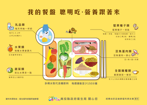 衛生福利部國民健康署推出「我的餐盤」,將每日所需攝取的全穀雜糧、豆魚蛋肉、蔬菜、水果、乳品與堅果種子6大類食物,依每日應攝取的份數轉換成體積,並以「餐盤圖像」呈現各類別比例。