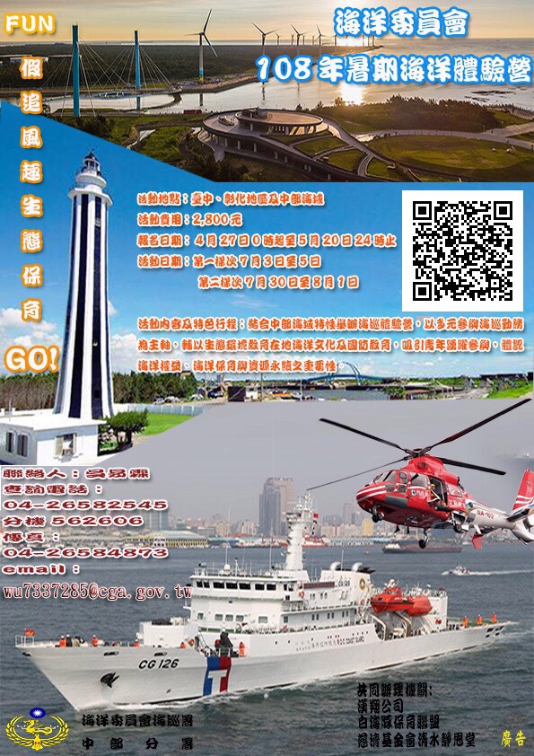 為豐富民眾對海洋之認知,培養對於藍色國土之情感,以「體驗海巡,海洋永續」為主軸,海洋委員會指導規劃「108年暑期海洋體驗營」一系列活動,參加對象更由原本大專院校學生擴展至高中職學生。中部分署特選定台中、彰化沿海地區及中部海域舉辦「FUN假追風趣,生態保育GO!」海巡生活體驗,藉由近距離觀摩海巡勤務之執行及體驗,了解海防第一線執法人員為守護藍色國土及確保民眾生命財產安全所做的努力。