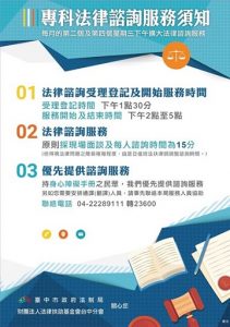 為協助市府處理勞資糾紛、消費者卡債及家事案件等法律問題,台中市政府法制局與財團法人法律扶助基金會台中分會合辦專科律師駐點諮詢服務,由該會指派法扶律師,從自5月起每月第二及第四個星期三下午進駐市府台灣大道市政大樓文心樓10樓法制局消費者服務中心專科法律諮詢室,首波將在5月8日、5月22日下午2時起提供法律諮詢服務,歡迎多加利用。