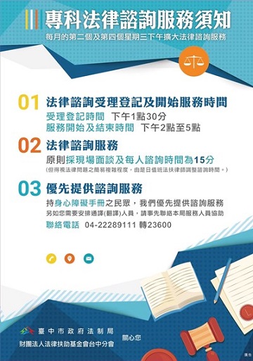 另外,為協助身心障礙者保障法律權益,這次開設的法律諮詢服務優先提供身心障礙者使用,並考量讓各類身心障礙者均能使用服務,對於聽語障或行動不便朋友,只要預先提出申請,將針對不同的服務對象事先安排通譯(翻譯)人員於諮詢過程全程協助,或改採線上電話諮詢服務方式,歡迎身障朋友預約登記使用。預約專線04-22289111轉23600。