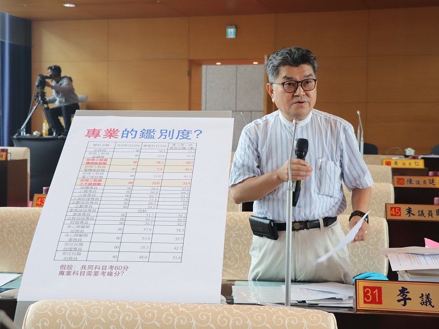 以助理工程員(電機維修類)23.1分為例,若依共同科目占比30%與專業科目占比70%推算,假設共同科目考60分,加權後分數為18分,專業科目的加權分數為23.1-18=5.1分,專業科目的原始分數只需7.3分就能進入面試,李中議員質疑這樣的成績專業鑑別度何在?