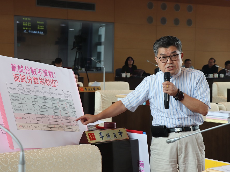 臺中市議員李中接獲考生陳情,質疑去(107)年度台中捷運公司舉辦的基層人員公開招考考試不公,經他向新任捷運公司董事長林志盈調閱筆試成績後,赫然發現許多類組錄取者的筆試成績偏低且落差極大,林志盈董事長今日在議會接受質詢時,對當時筆試成績未計入總成績表示不妥,也承諾會透過內部考試擇優汰劣,未來考試的試題與答案及考試相關事項都會具體公開。