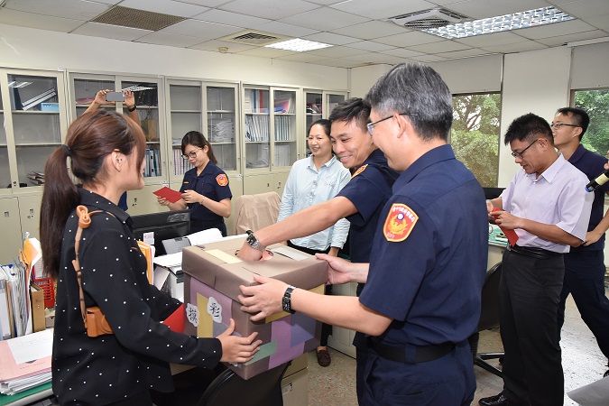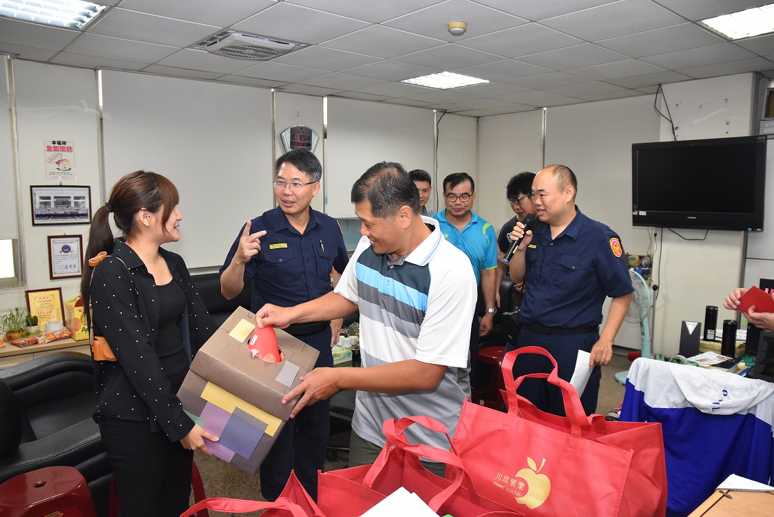 臺中市政府警察局烏日分局為慶祝108年警察節,特別於12日上午,除頒發10年、20年及30年資深績優員警獎章外,還邀請烏日警友辦事處主任陳常獎頒贈員警每人200元超商禮卷,並在分局四樓禮堂辦理刮刮樂趣味摸彩活動,每人依刮得的獎項來領取獎品,獎品豐盛包羅萬象有品牌香水、面膜、精油運動貼布、桌上型電風扇等,現場驚呼連連,熱鬧非凡。