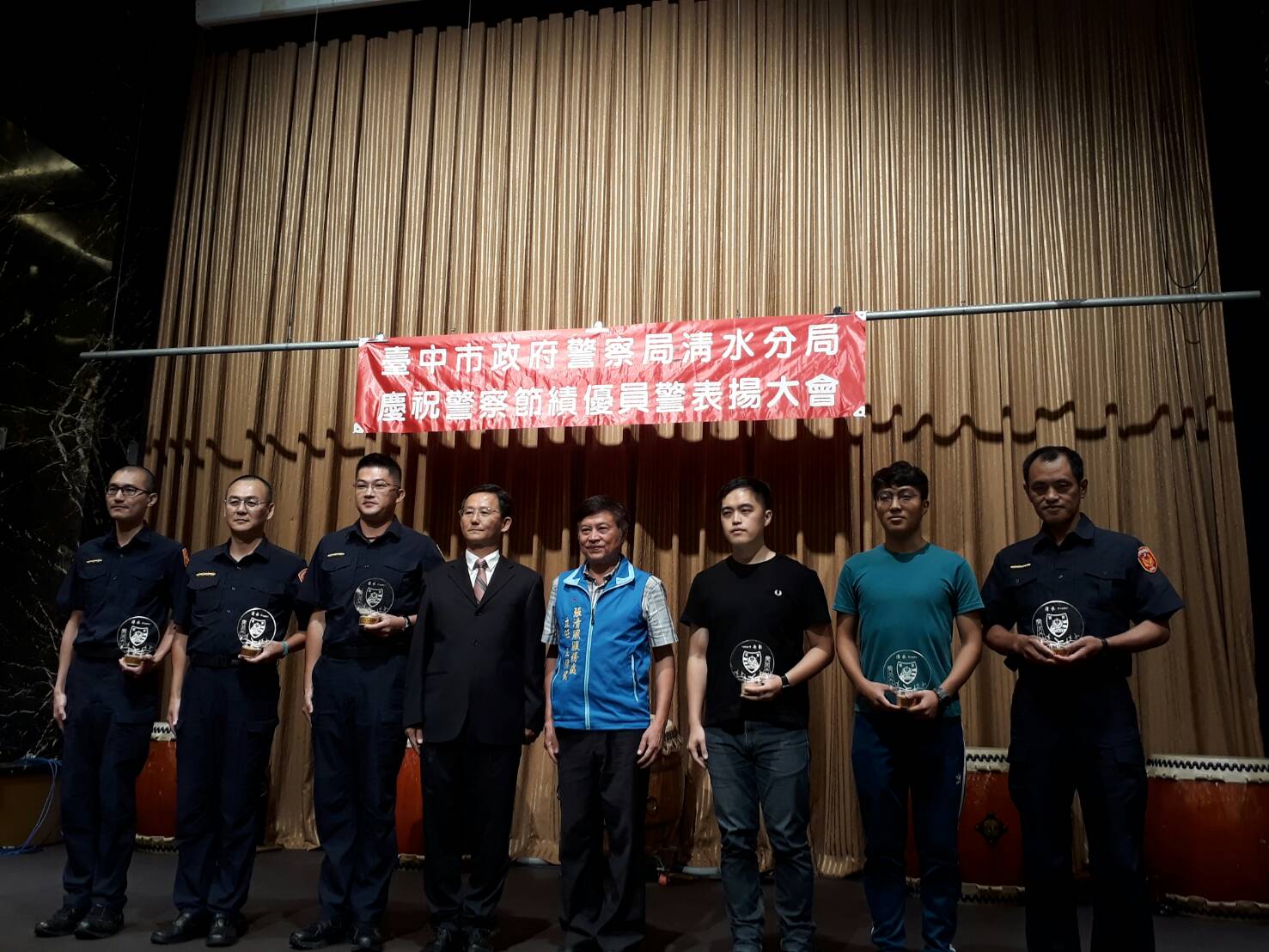 臺中清水警分局於6月14日晚上舉辦慶祝警察節及警察好神金sir獎活動。清水警分局為慶祝警察節活動,特舉辦警察好神金sir獎,有如警界金像獎,獎項共分治安類(打詐尖兵、緝毒戰士、槍砲戰神、抗暴英雄、無所遁形)、交通類(執法悍將、酒駕剋星、馬路先鋒)、為民服務類(尋人高手、熱血善警)及績優內勤、事務人員等12種獎項,各獎項評比人員為分局同仁過去一年整體表現進行選拔,經過分局評審團約一個月的初選及複選程序等嚴格評選,最後才產出得獎名單,得獎人可說是分局該項成績最亮眼的員警。