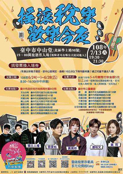台中市政府地方稅務局將於7月13日晚上7時30分在台中市中山堂舉辦「搖滾稅樂 歡樂今夜」演唱會,邀請歌手潘裕文、黃莉、蔡旻佑、黃美珍及台中在地樂團獨立人種同台演唱。6月24日起至28日止,至稅務局各分局、市立圖書館總館及分館,捐贈今年5月至6月實體發票6張或雲端發票4張,即可兌換入場券;此外,台中購物節將於7月10日登場,稅務局歡迎演唱會後,轉往附近商圈消費,累計滿500元即可參加千萬豪宅、名車等抽獎。