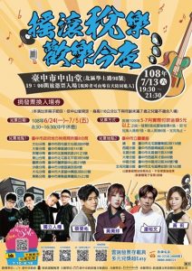 台中市政府地方稅務局將於7月13日晚上7時30分在台中市中山堂舉辦「搖滾稅樂 歡樂今夜」演唱會,邀請歌手潘裕文、蔡旻佑、黃美珍及台中在地樂團獨立人種同台演唱。即日起至7月5日止,至稅務局各分局、市立圖書館總館及分館,捐贈今年5月至6月實體發票6張或雲端發票4張,即可兌換入場券,每人限換6張,兌完為止。此次募得發票將全數捐贈台中市慈善單位。