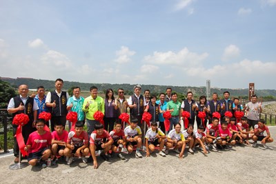 市府觀光旅遊局今天在外埔區忘憂谷磁瑤堤頂舉辦「台中市甲后線自行車道建置工程」啟用典禮,由楊副市長、立法委員洪慈庸、市議員吳敏濟、施志昌、觀光旅遊副局長陳育正等人共同剪綵,宣布甲后線自行車道啟用。