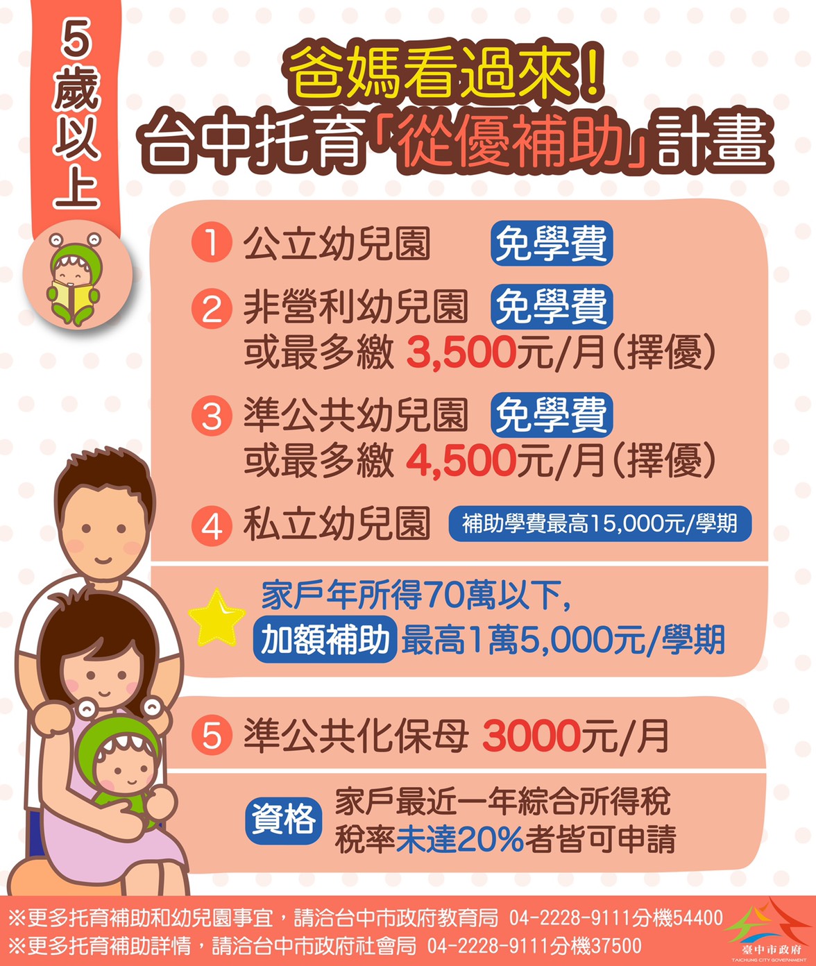 新聞局提醒,相關補助資訊,可至台中市政府網站(http://bit.ly/2JC2cdW)、市府教育局網站「台中市準公共化機制專區」(http://bit.ly/2Yfo58b)及社會局網站「擴大育兒津貼」專區(http://bit.ly/2K1iOfs)查詢。
