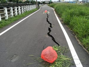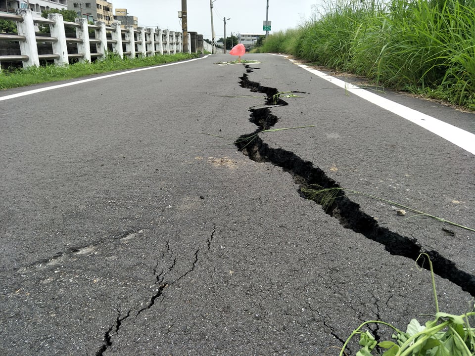 近日因連日豪雨各地區道路崩塌意外頻傳,台中梧棲區梧棲大排的三條圳也不例外,竟龜裂出15公分寬的裂痕造成3~5尺的深度,整條道路往大排方向傾斜,實讓人怵目驚心。