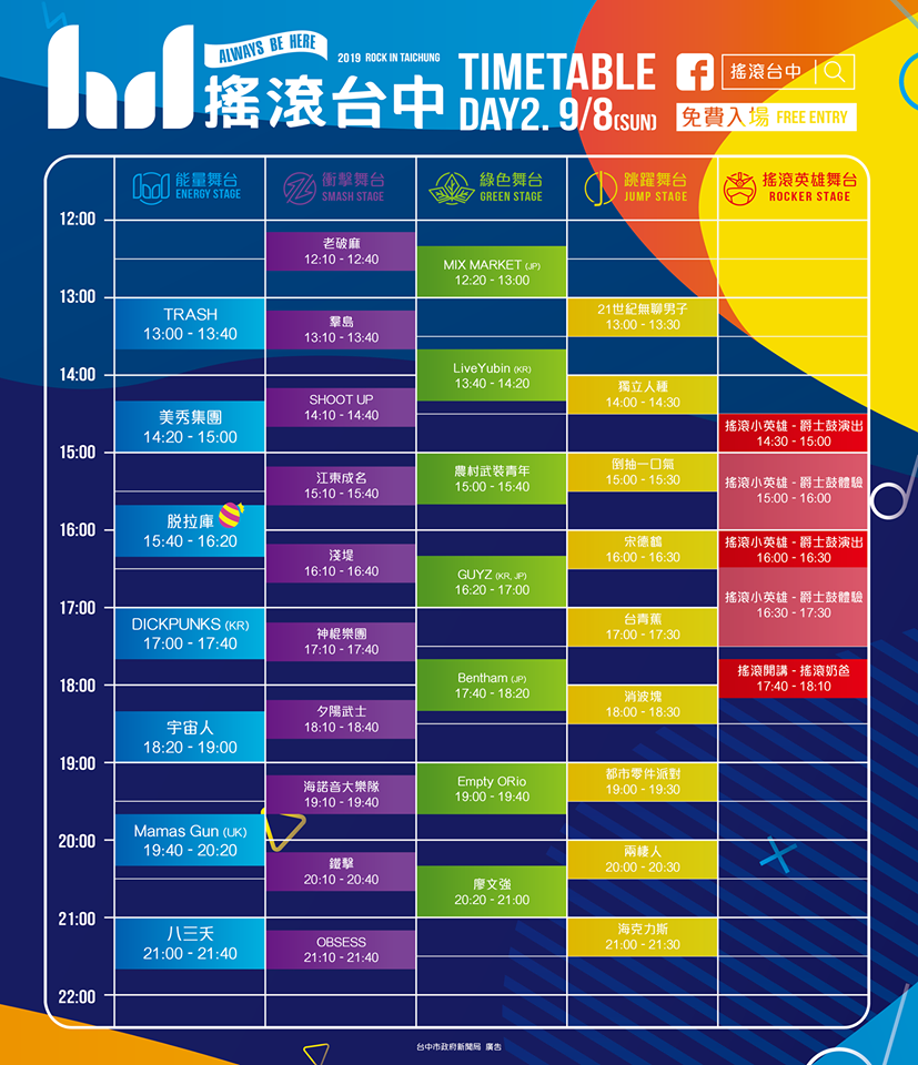 新聞局表示,為吸引更多各個年齡層的觀眾,今年「搖滾台中」規劃五大活動區域,包括能量舞台、衝擊舞台、綠色舞台、跳躍舞台等四大舞台;此外,更首度新創「搖滾英雄─親子互動體驗區」,讓父母帶著孩子一起體驗爵士鼓,培養孩子對音樂的興趣,認識搖滾台中。