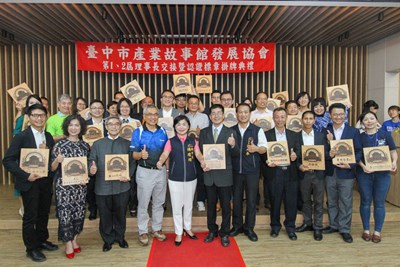 今日台中市產業故事館發展協會理事長與理、監事交接,包含29家會員及產、官、學各界逾百餘家業者共襄盛舉,現場串連台中故事館首席創舉,進行「協會認證標章掛牌」,典禮結束後各別掛在29家故事館內,提供遊客清楚辨識。