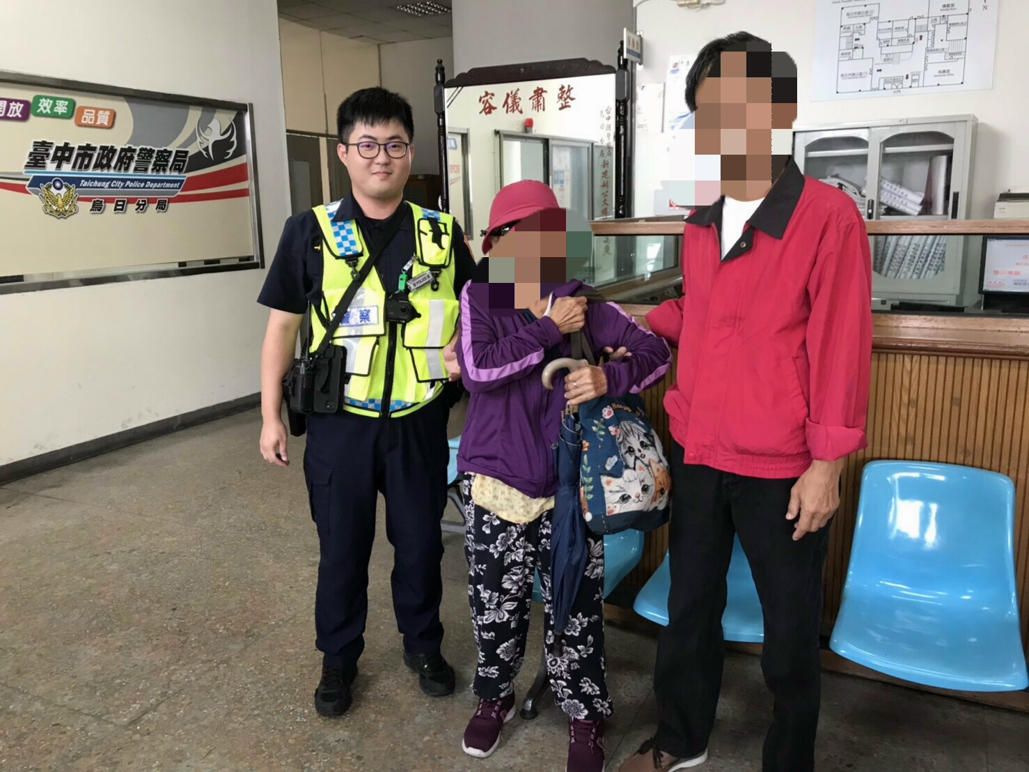 警員上前詢問關懷時,於交談間發現老阿嬤不願意回答自己的名字及住址,也記不得家裡聯絡電話,起初雙手緊抱手上的包包及雨傘,不願意讓員警檢視,對民眾、志工媽媽及員警存有戒心,經警員耐心溫馨關懷,努力安撫溝通下,阿嬤才慢慢卸下心防,願意和員警講話,由於阿嬤口齒不清,不知道她講什麼東西,員警也真摸不著頭緒,陷入膠著,最後在阿嬤的雨傘上發現她的名字及連絡電話,才順利找到阿嬤的家人,讓她及早回到南屯溫暖的家休息,真正揪感心耶!!。