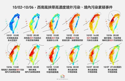 環保局表示,米塔颱風過境後,10月2日凌晨,台灣迎來第一波境外汙染,西半部空品不良;3日下午4時,風場趨於靜風,境外汙染物及境內汙染物持續滯留,空品仍差;4日凌晨起,西半部再迎來另一波境外汙染;5日中部地區位處背風帶;今日汙染物持續滯留打轉,提醒民眾外出配戴口罩,做好自我防護。