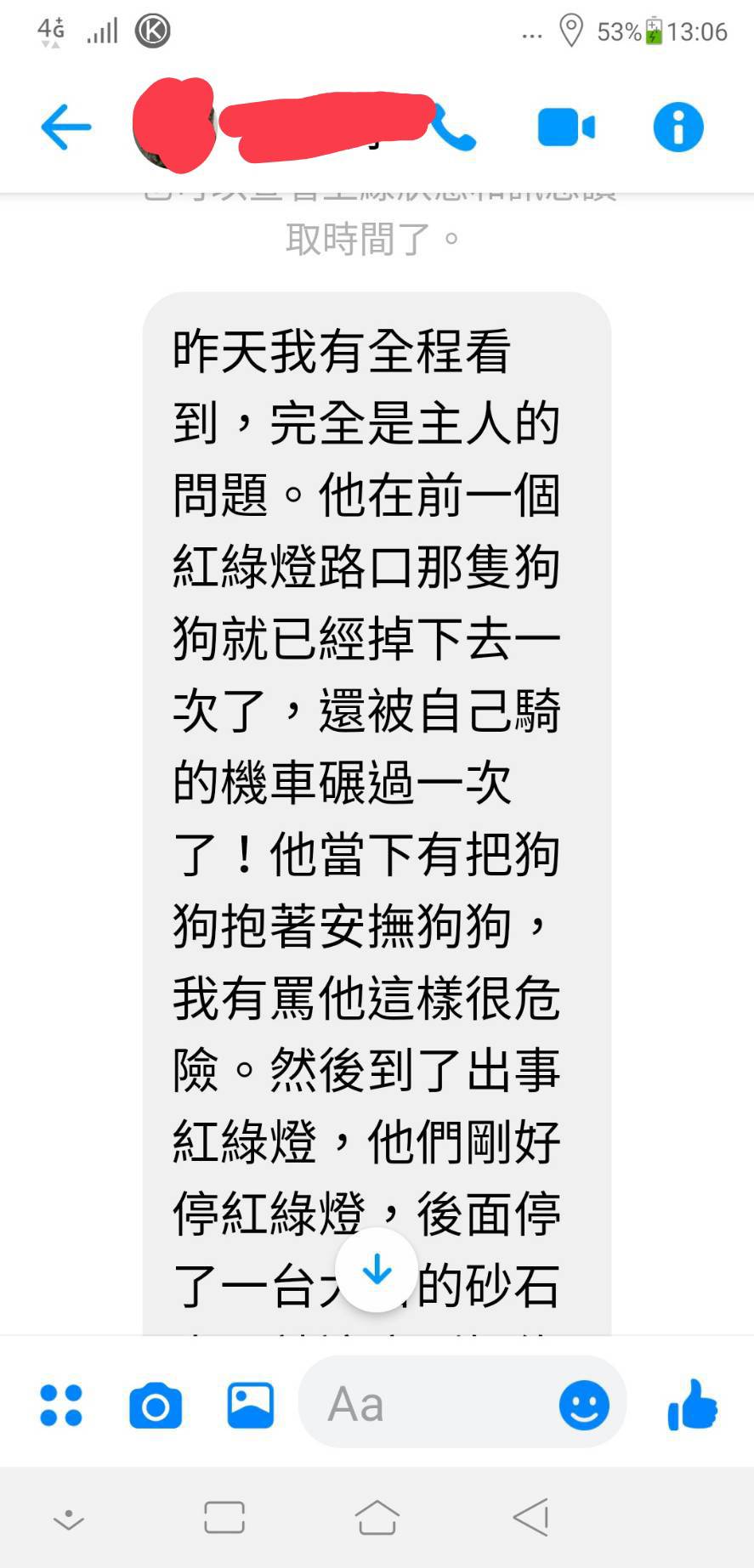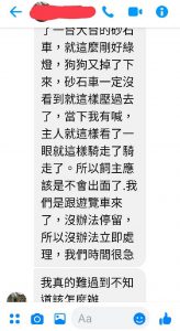 10月10日當天下午於台中市林森路與柳川東路口發生毛孩遭輾,據路人所述,當下毛孩已在前一個號誌路口從機車上掉下來,飼主還不小心自己輾過毛孩,飼主雖有趕緊安撫毛孩,但隨後一台砂石車經過,毛孩來不及閃避不幸被輾過,飼主竟當場騎車離去,彷彿一切沒發生過。