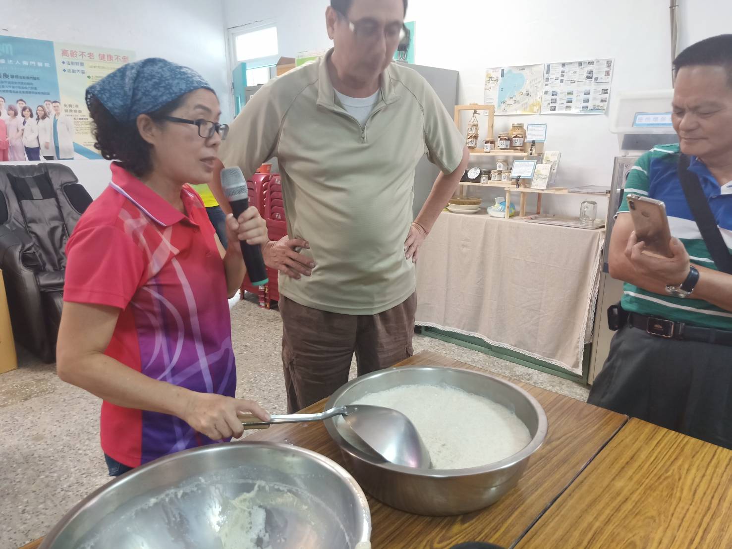 第三站於後彎社區–體驗鹽滷豆腐DIY,屏東縣車城鄉後灣社區發展協會也是社區照護關懷據點;後灣社區發展協會王美又營造恆春後彎社區漫遊 體驗DIY製作鹽滷豆腐,後灣村民們將海水沖上岸邊的珊瑚岩石上,經日曬蒸發,村民會在岩石將已結晶的海鹽收集(法國人又稱之為「鹽之花」),或從潮池中收集未完全蒸發的海水,即是《鹽滷》,而一般市面上吃到的豆腐,是用石膏粉將之凝固,《鹽滷》是製作手工豆腐必要材料,《鹽滷》也取代石膏粉的天然凝固媒介。