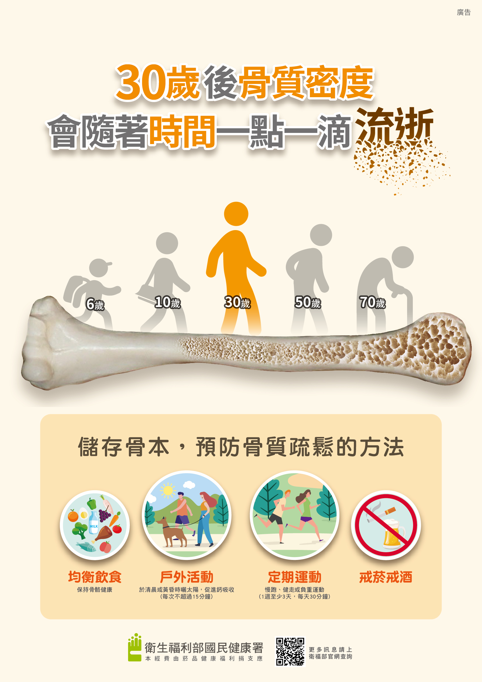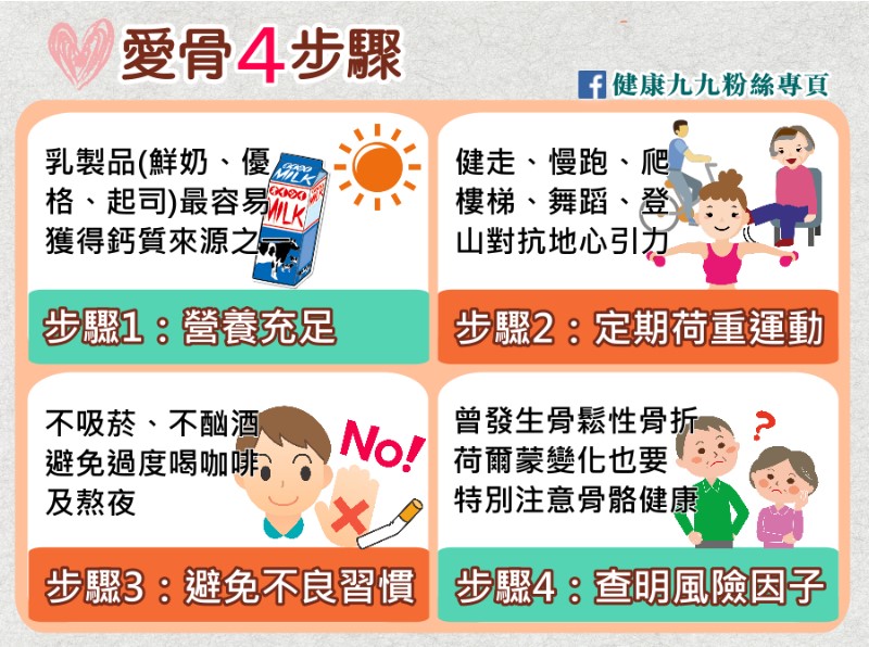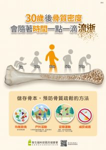 曾局長呼籲民眾定期接受骨質密度檢查,及早就醫及早治療,可能患有骨質疏鬆症的停經後女性,日常生活中彎腰或搬重物等小動作都有機會導致骨折的風險,應盡量避免,平時多要加注意駝背、變矮等身高變化;此外,平時避免吸菸、飲酒及熬夜,都讓骨骼更加健康。