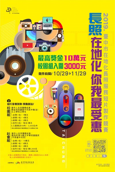 長照服務短片製作競賽,10萬元獎金等你拿!台中市政府衛生局舉辦「2019台中市在地化長照服務短片製作競賽」,希望以台中市長照資源、服務為主題,鼓勵學生及社會人士組隊拍出創新、觸動人心的作品,讓更多民眾知道長照服務相關資訊,喚起社會大眾對年長者照護議題的關注,徵件自即日起至11月29日止,歡迎踴躍報名參加。