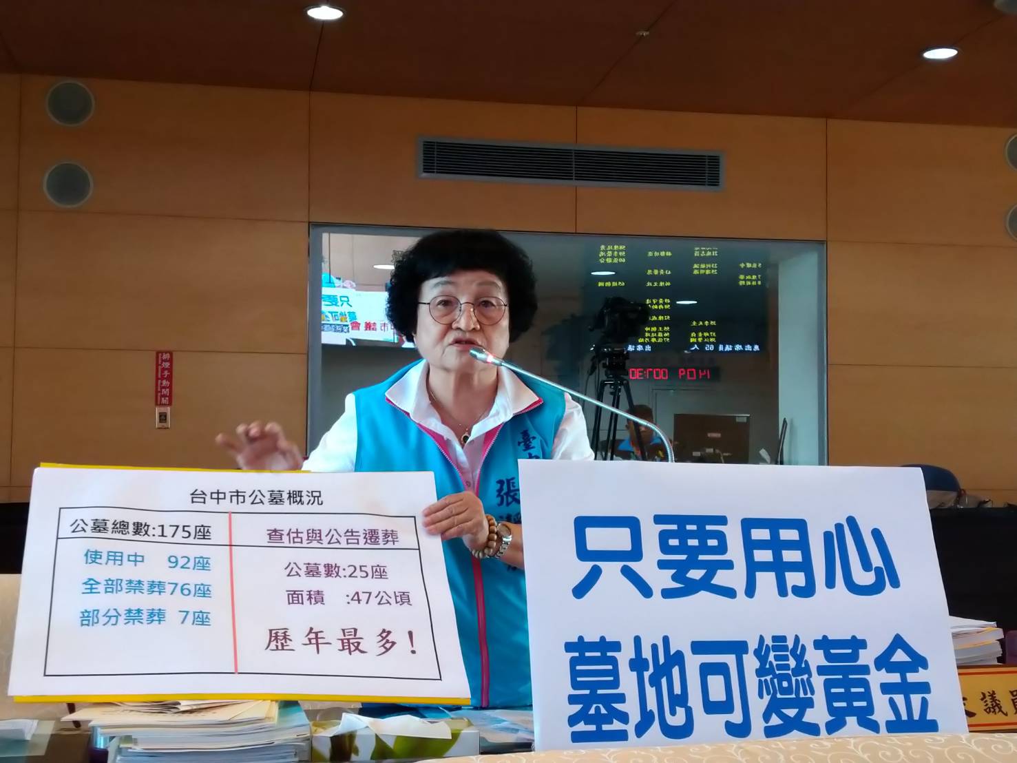 張議員表示,過去他擔任豐原市長時完成三處公墓遷葬,當時前市長胡志強也積極配合興建社會住宅、果菜批發市場、公老坪公園綠地等,顯示只要用心做,公墓也可以變黃金,如今台中市政府積極推動公墓遷葬,可望釋出74公傾土地,將來不但可以開闢公園綠地,還可以興建活動中心、運動場館、學校等,讓土地有效利用,也大幅改善市容景觀。