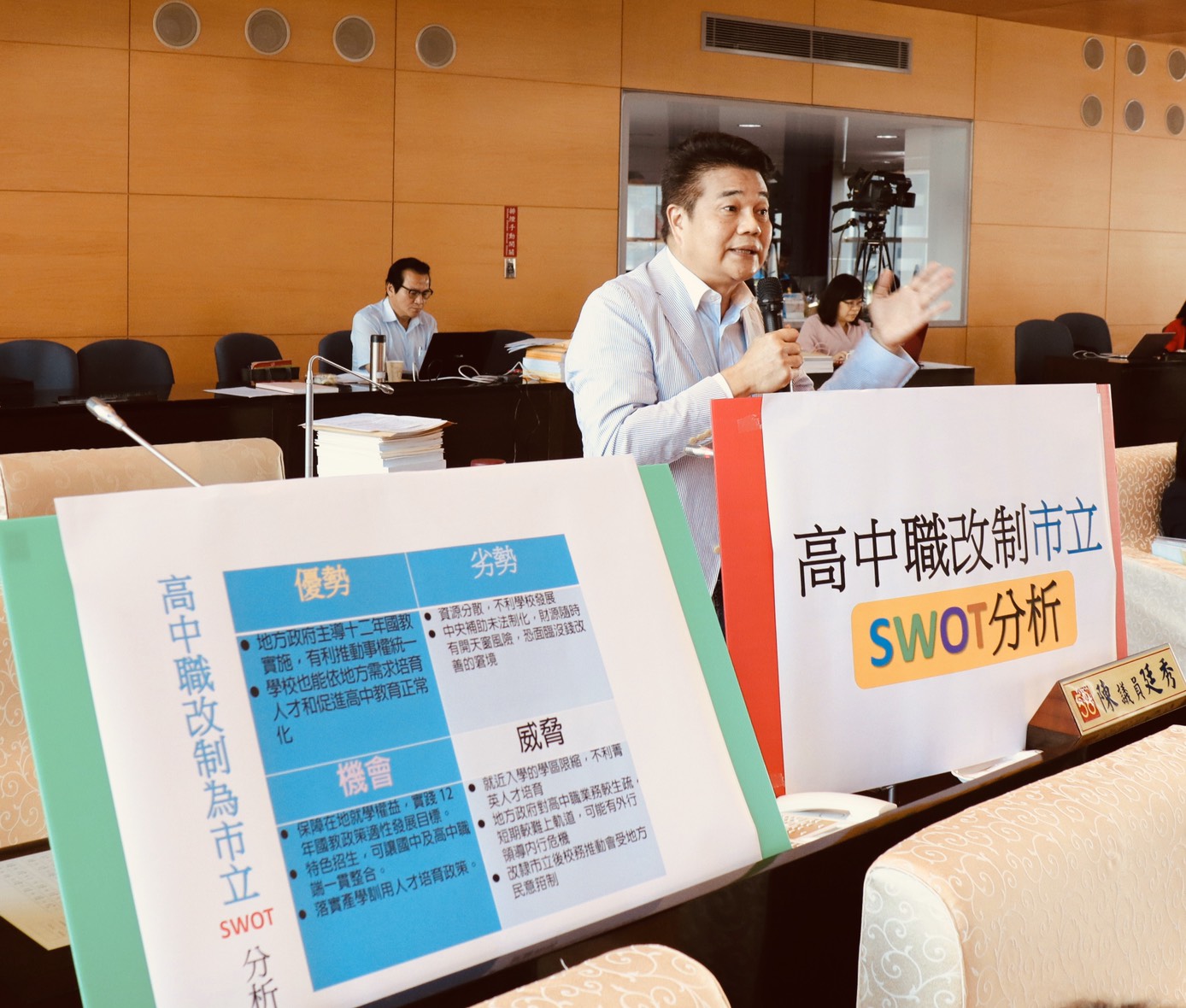 最後,陳議員強調,目前國立改制市立後人財兩缺的問題一一浮現,造成教育資源分配不均,盼中央挹注資源,也期盼市府結合大台中地區不分黨派立委,共同努力爭取預算,共同解決高中職改制後的教育困境。