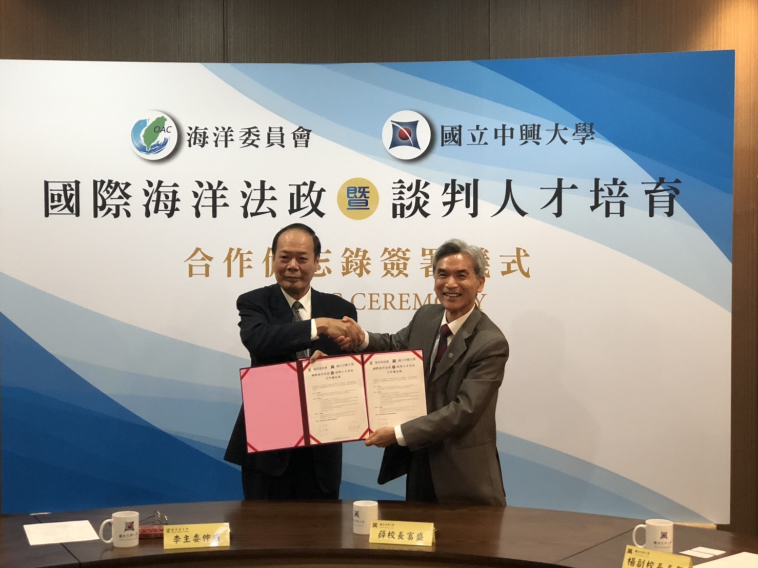 為培育具備國際海洋法律、政策及國際談判專業知能人才,以掌握國際海洋發展趨勢,並維護國家海洋權益,海洋委員會於108年11月12日與國立中興大學簽署合作備忘錄,攜手合作共同推動國際海洋法政暨談判人才培育。