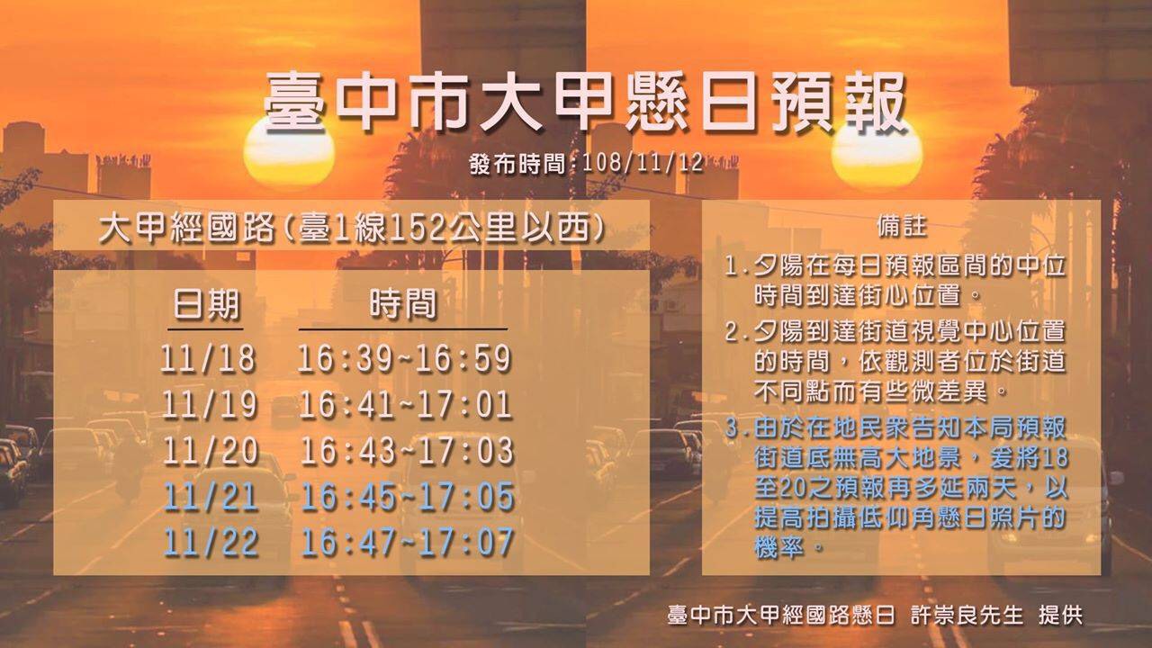 11月18日至22日大甲地區將連續有五天絕美的「懸日」現象,依交通部中央氣象局資料,係指太陽在低仰角時,陽光穿過大氣層之路徑較長顏色偏橘或橘黃,若此時太陽恰位於兩側高樓林立街道底端,即形成金黃色樓景中間夾著太陽瑰麗壯觀景象,此現象即將於本日下午16時39分至16時59分出現在臺中市大甲區經國路上,預計將吸引眾多市民駐足觀賞或攝影,盧秀燕市長特別請警察局加派警力維護觀賞、攝影與行人等交通安全。